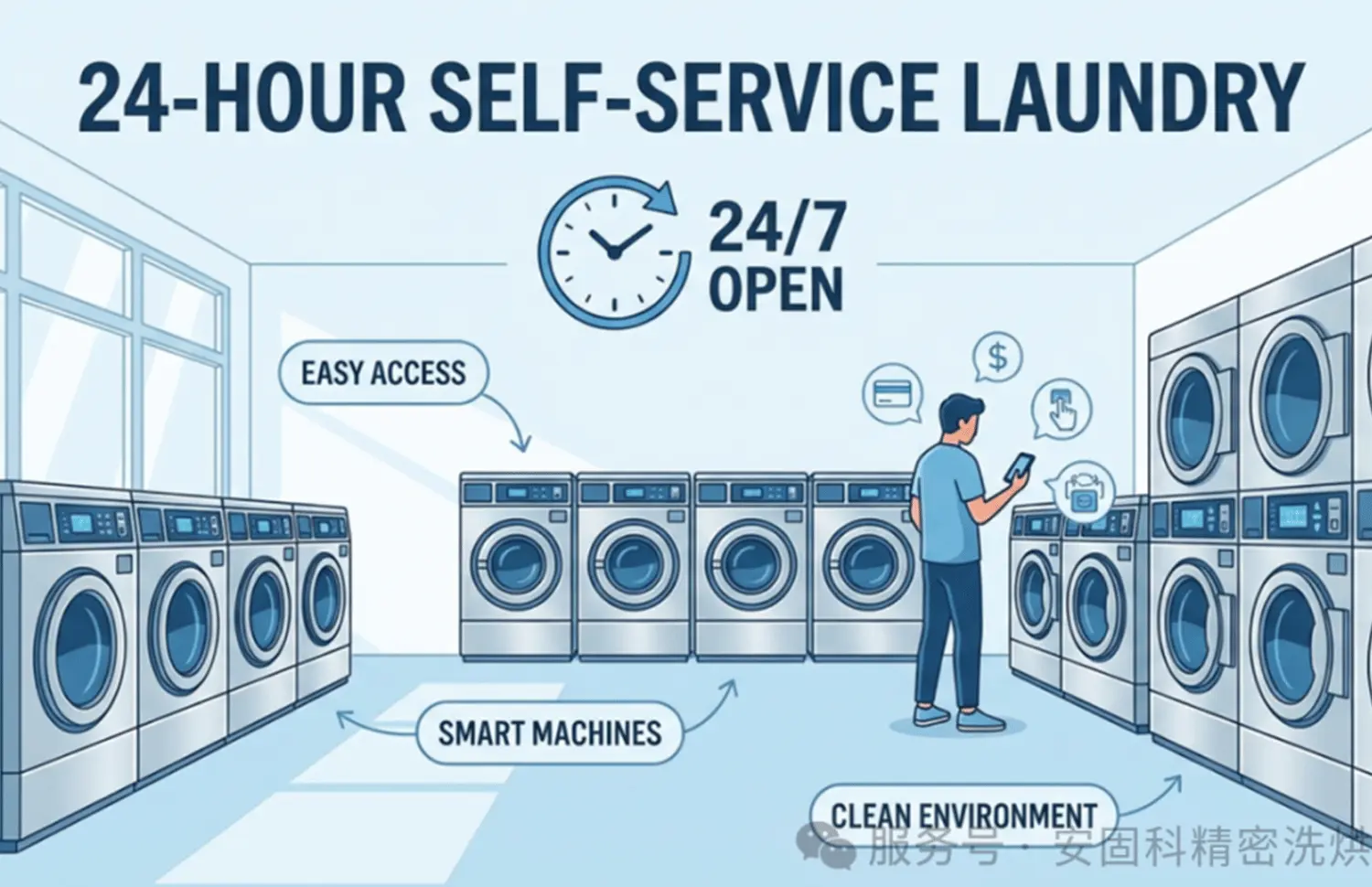 Self-service laundromats operate 24/7 without staff supervision, allowing customers to independently operate machines to complete both washing and drying cycles.